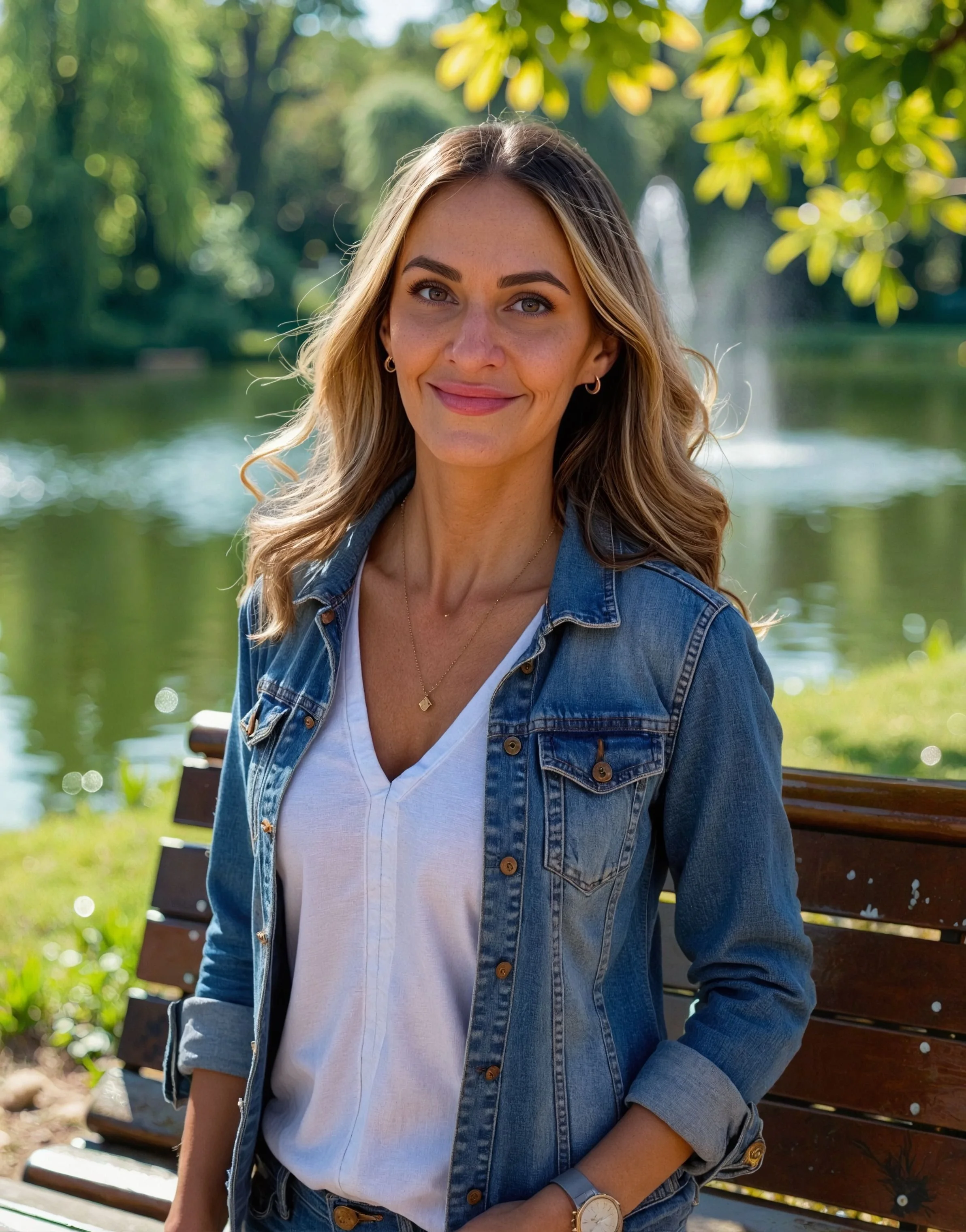 A woman with dark blonde wavy hair, wearing a denim jacket over a white shirt, sitting on a park bench near a lake with a fountain, surrounded by green trees and foliage.